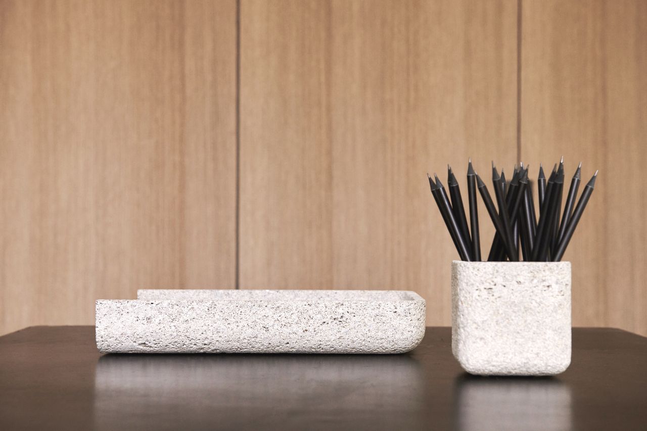 CARVED FROM A SINGLE BLOCK OF SOLID NATURAL STONE, THIS PENCIL HOLDER IS A QUIETLY...