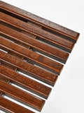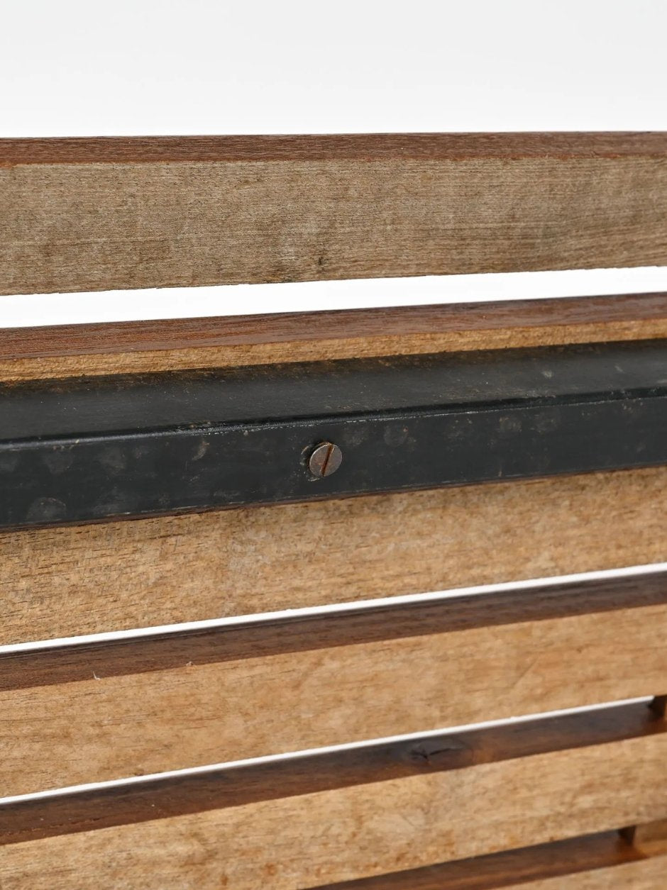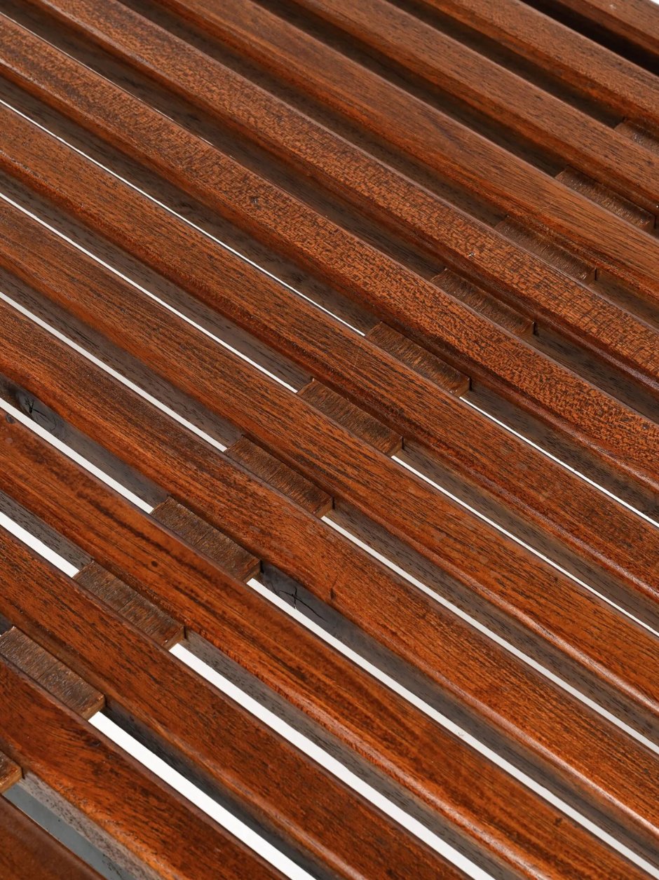 THIS EXAMPLE IS DISTINGUISHED BY THE QUALITY AND DEPTH OF ITS PATINA. THE MAHOGANY HAS DEVELOPED A DEEP PATINA OVER TIME, RESULTING IN A WARM, SATURATED TONE WITH SUBTLE VARIATIONS ACROSS THE SLATS. THE SURFACE RETAINS HONEST TRACES OF AGE AND USE, GIVING THE WOOD A SOFTNESS AND MATERIAL PRESENCE RARELY FOUND IN REFINISHED EXAMPLES. THE RHYTHM OF THE SLATS AND THE DENSITY OF THE TIMBER ARE HEIGHTENED BY THIS NATURALLY MATURED FINISH.