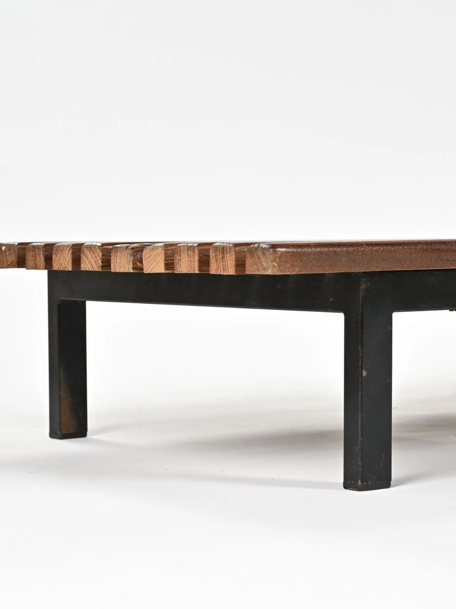 THIRTEEN-SLAT BENCH IN SOLID MAHOGANY RESTING ON A BLACK-LACQUERED METAL FRAME. DESIGNED BY CHARLOTTE PERRIAND AND PRODUCED BY STEPH SIMON BETWEEN 1959 AND 1967.