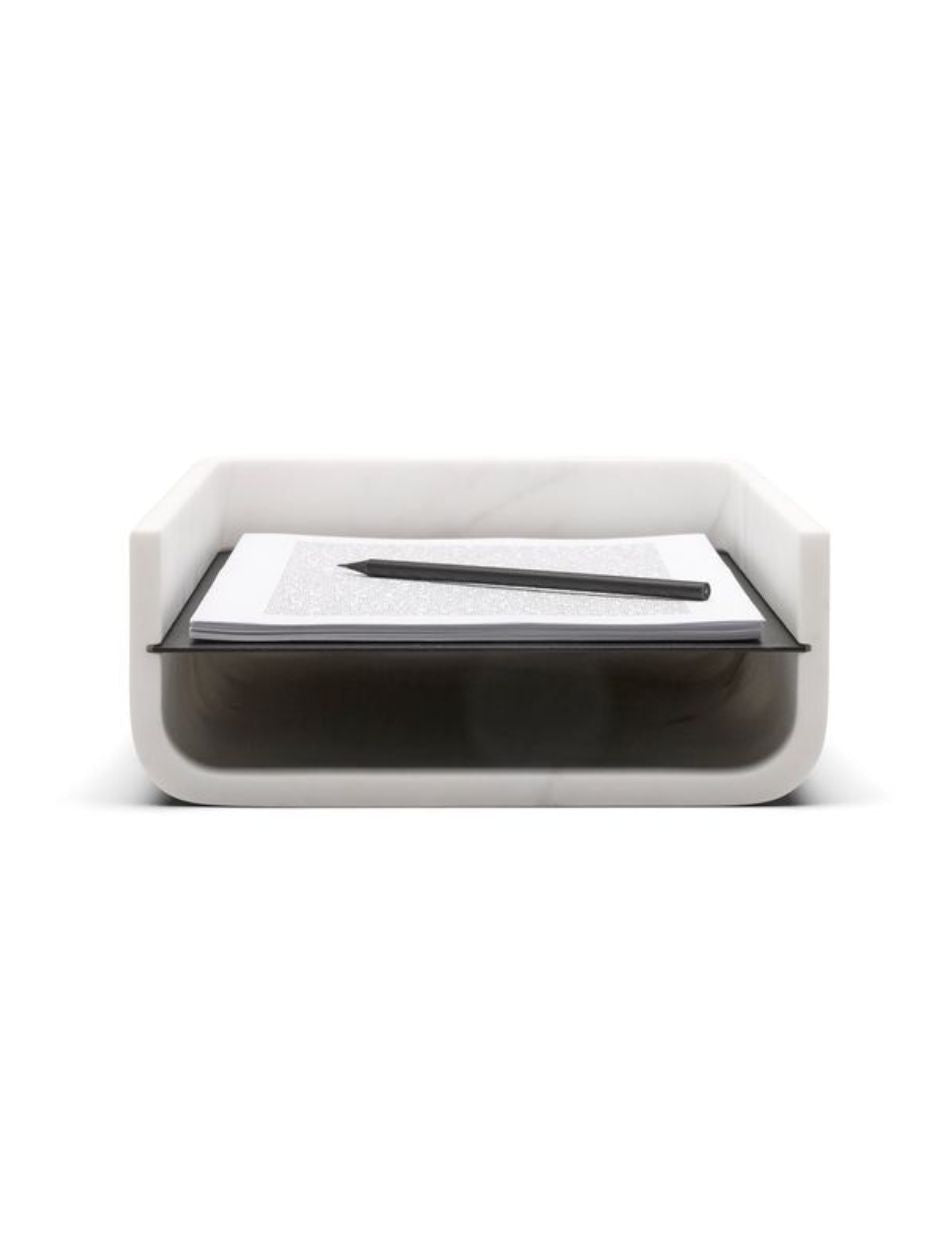 AVAILABLE IN GERMAN LIMESTONE, BLACK MARBLE OR WHITE MARBLE, EACH PIECE CELEBRATES THE NATURAL CHARACTER OF THE STONE — FROM SUBTLE VEINING TO MINERAL VARIATION. DESIGNED FOR EVERYDAY USE, IT HOLDS DOCUMENTS, PAPERS OR CORRESPONDENCE WITH EASE, BALANCING FUNCTION WITH SCULPTURAL PRESENCE.