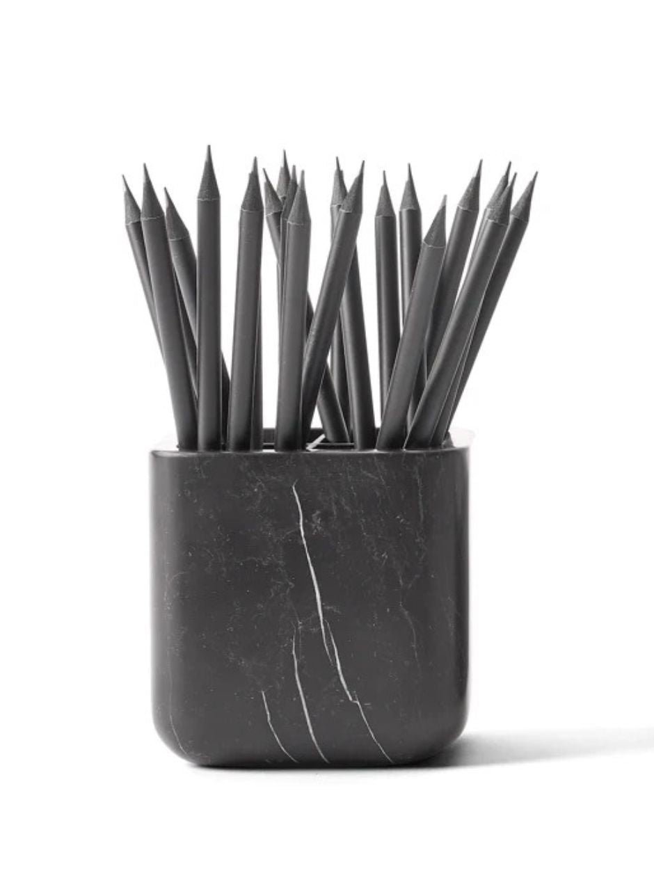 AVAILABLE IN GERMAN LIMESTONE, BLACK MARBLE OR WHITE MARBLE, EACH PIECE CELEBRATES THE INHERENT CHARACTER OF THE STONE, FROM SUBTLE VEINING TO NATURAL MINERAL VARIATION. DESIGNED FOR EVERYDAY USE, IT HOLDS PENCILS, PENS OR SMALL TOOLS WITH EASE, BALANCING FUNCTION WITH SCULPTURAL PRESENCE.